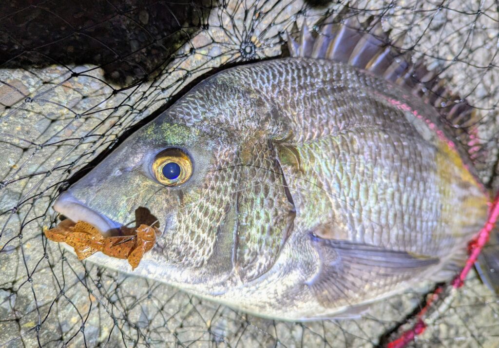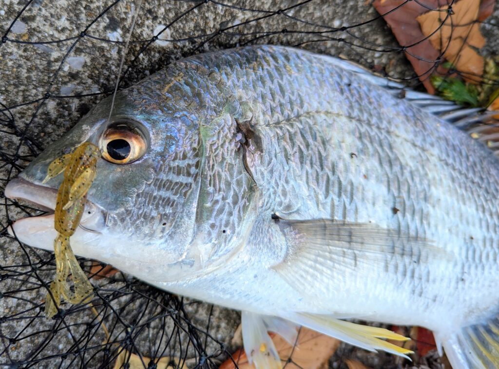 これと言った潮目もなく、ただ海底にはゆっくりと押し上げる潮の動きがあったので、ボトムの変化を探りながら少しづつ移動しながらキャスティングを続けると・・・モソモソとワームに触れる感触・・・巻いては止めてとい感じで繰り返していましたが、気持ち長めに巻いてピタッと止めたとたんに鋭くヒット!元気が良く、ぐんぐん引き込んでドラグが鳴ります。そしてランディングすると40センチくらいのチヌ(クロダイ)でした。