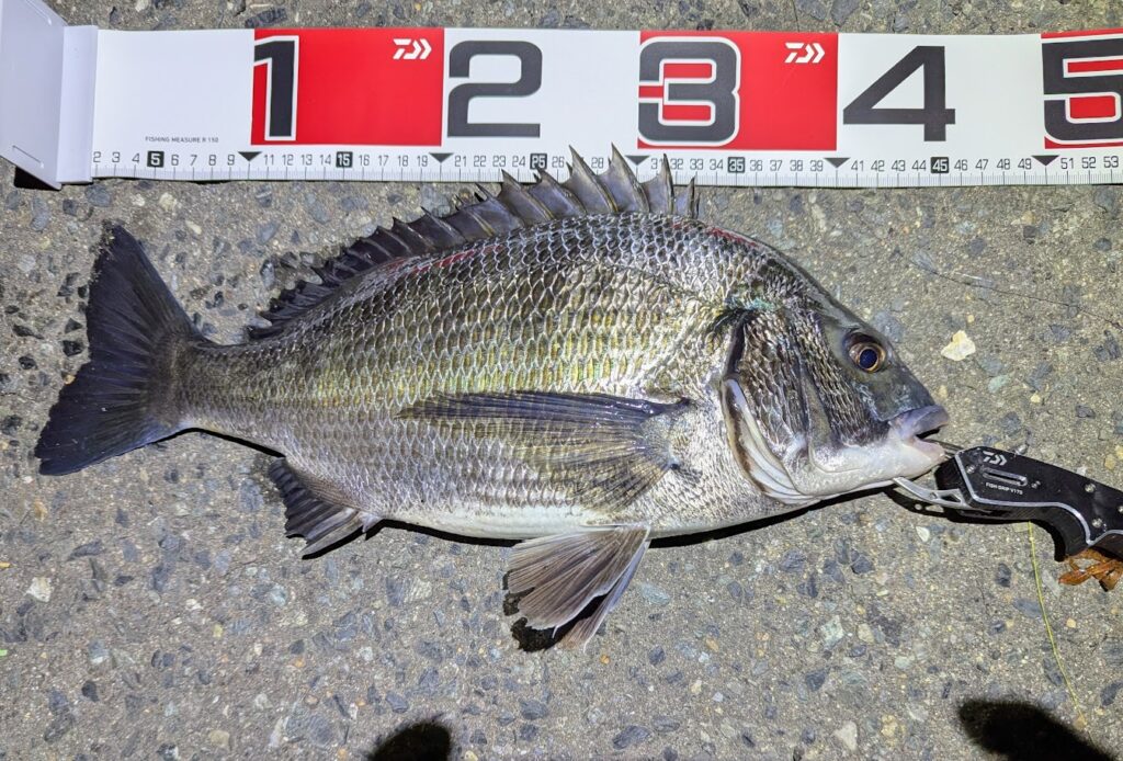 メジャーで測ると45センチくらいのプリプリのチヌでした。今日はあまり馴染みがないポイントだったので、遠投して海底の状況を探る目的だったので大げさなタックルでの釣行でしたが、海底の状況が大まかに分かったので、次回はいつものチニング専用タックルで臨みたいと思います。